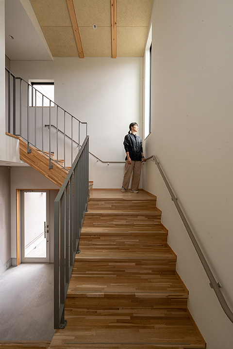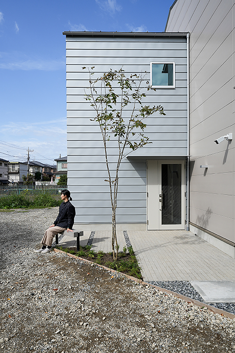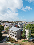 1階がオーナー様住居、2・3階は共同住宅とした鉄筋コンクリート造(RC造)のビルです。オーナー様住居は、天然木を極力使用し、温かみのある空間としています。また、お住まいになるオーナー様の年齢を考慮し、段差をなくし全て引き戸にするなどバリアフリー化に努め、 床下に暖房を吹込むOMソーラー社のパッシブエアコンを採用。これにより、トイレも脱衣室も温かくヒートショックを防ぎます。上階の共同住宅は地域の賃貸需要のマーケティングから、2階はワンルーム、3階は1LDKとしました。2階と3階で相違しているとプランニングや電気・設備の計画が非常に難しくなるなか、様々な工夫をすることで実現しています。外観はRC打放しとしモダンなデザインとし、通りの中でも特徴的な建物としました。