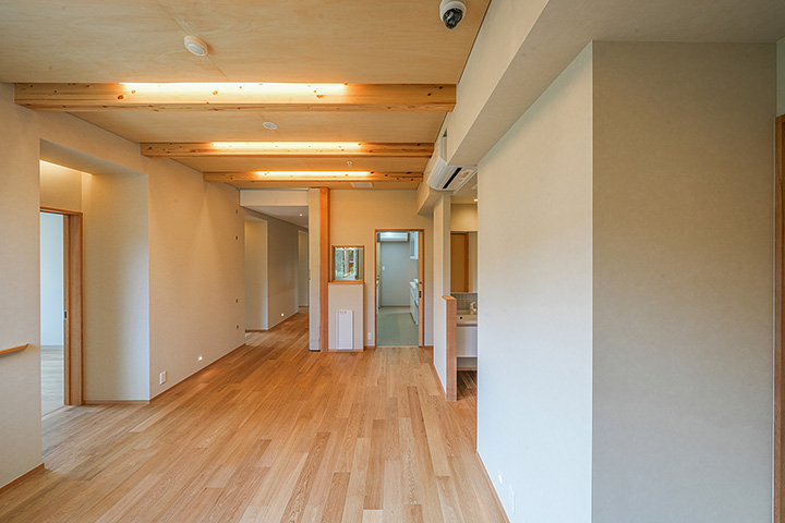 ご夫婦二人が住まわれる平屋の住宅。お客様がご年配であることからバリアフリーデザインといたしました。玄関までの導線にスロープを設け、廊下は広めに、各部屋の扉は全て引き戸としています。また、足腰の負担を軽減するためコンセントを通常より高めに設定、低い収納をなくすなどの工夫を盛り込みました。温熱環境については、床下にルームエアコンを吹き込む工法を取り入れ、トイレや脱衣室を含む家全体が暖かい空間となるように設計、ヒートショックの防止にも効果的です。また、デザイン的な特徴として、リビングの天井を木構造現しの勾配天井に、壁はしっくいとして柔らかく健康的な空間としています。