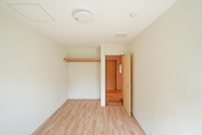 施設ではなく住居であることを強く意識して設計、少しおしゃれなグループホームを目指しました。地域になじむよう建物高さは低く抑え、外観の色は控えめに。室内は、木の雰囲気を残し壁紙はベージュ系を採用、温かい空間を造りました。また、トイレや脱衣室は清掃し易い壁材としたり、各個室の天井には吸音板を使用、蹴破り対策として扉を通常より厚くする等、細かい機能的な配慮もしっかりおこないました。