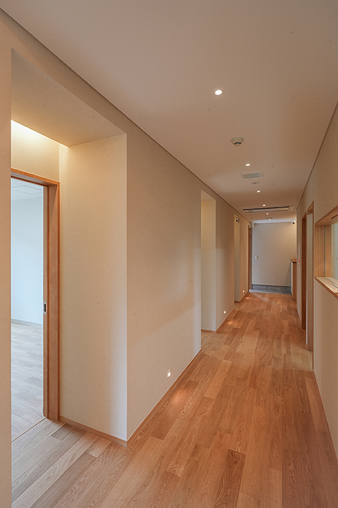 テナント型の小規模保育園。暗くなりがちな都市にあるテナント型保育園において、内装材として明るい色の天然木を使用することにより柔らかい空間に、そして、間接照明の多用と照明を工夫した疑似トップライトによりとても明るい空間を実現しています。