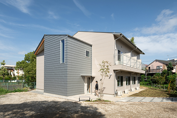 1階がオーナー様住居、2・3階は共同住宅とした鉄筋コンクリート造(RC造)のビルです。オーナー様住居は、天然木を極力使用し、温かみのある空間としています。また、お住まいになるオーナー様の年齢を考慮し、段差をなくし全て引き戸にするなどバリアフリー化に努め、 床下に暖房を吹込むOMソーラー社のパッシブエアコンを採用。これにより、トイレも脱衣室も温かくヒートショックを防ぎます。上階の共同住宅は地域の賃貸需要のマーケティングから、2階はワンルーム、3階は1LDKとしました。2階と3階で相違しているとプランニングや電気・設備の計画が非常に難しくなるなか、様々な工夫をすることで実現しています。外観はRC打放しとしモダンなデザインとし、通りの中でも特徴的な建物としました。